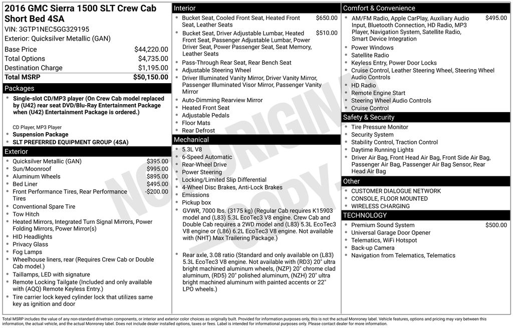 6-Speed Automatic Electronic with Overdrive, Jet Black Leather, 10-Way Power Driver's Seat Adjuster, 110-Volt AC Power Outlet, 150 Amp Alternator, 20" x 9" Polished Aluminum Wheels, 4-Wheel Disc Brakes, 4.2" Diagonal Color Display Driver Info Center, 40/20/40 Front Split Bench Seat, 6 Speakers, 6-Speaker Audio System, ABS brakes, Adjustable pedals, Air Conditioning, Alloy wheels, AM/FM radio: SiriusXM, Auto-dimming door mirrors, Auto-Dimming Inside Rear-View Mirror, Auto-dimming Rear-View mirror, Automatic temperature control, Auxiliary External Transmission Oil Cooler, Bodyside moldings, Bose Speaker System, Brake assist, Bumpers: chrome, CD player, Chrome Bodyside Moldings, Chrome Door Handles, Chrome Mirror Caps, Color-Keyed Carpeting w/Rubberized Vinyl Floor Mats, Compass, Deep-Tinted Glass, Delay-off headlights, Driver & Front Passenger Illuminated Vanity Mirrors, Driver door bin, Driver vanity mirror, Dual front impact airbags, Dual front side impact airbags, Dual-Zone Automatic Climate Control, Electric Rear-Window Defogger, Electronic Stability Control, Emergency communication system: OnStar Guidance, Exterior Parking Camera Rear, EZ Lift & Lower Tailgate, Floor Mounted Console, Front anti-roll bar, Front Center Armrest w/Storage, Front dual zone A/C, Front fog lights, Front Full Feature Power Reclining Bucket Seats, Front reading lights, Front wheel independent suspension, Fully automatic headlights, Garage door transmitter: HomeLink, HD Radio, Heated & Vented Front Bucket Seats, Heated door mirrors, Heated Driver & Front Passenger Seats, Heated front seats, Heavy Duty Suspension, Heavy-Duty Rear Locking Differential, Illuminated entry, Leather Appointed Seat Trim, Leather Wrapped Steering Wheel w/Cruise Controls, LED Cargo Box Lighting, LED Tailamps w/Signature, Low tire pressure warning, Manual Tilt/Telescoping Steering Column, Memory seat, Occupant sensing airbag, OnStar 6 Month Guidance Plan, OnStar w/4G LTE, Outside temperature display, Overhead airbag, Overhead console, Panic alarm, Passenger door bin, Passenger vanity mirror, Power Adjustable Pedals, Power door mirrors, Power driver seat, Power Folding & Adjustable Heated Outside Mirrors, Power passenger seat, Power steering, Power Sunroof, Power windows, Power Windows w/Driver Express Up & Down, Preferred Equipment Group 4SA, Premium audio system: IntelliLink, Radio data system, Radio: AM/FM Stereo w/8" Diagonal Color Touch Nav., Radio: AM/FM Stereo w/8" Diagonal Color Touch Screen, Rear 60/40 Folding Bench Seat (Folds Up), Rear reading lights, Rear seat center armrest, Rear step bumper, Rear Vision Camera w/Dynamic Guide Lines, Rear Wheelhouse Liners, Rear window defroster, Remote Keyless Entry, Remote keyless entry, Remote Locking Tailgate, Remote Vehicle Starter System, Security system, Single Slot CD/MP3 Player, SiriusXM Satellite Radio, Speed control, Speed-sensing steering, Split folding rear seat, Spray-On Pickup Box Bed Liner, Steering Wheel Audio Controls, Steering wheel mounted audio controls, Tachometer, Telescoping steering wheel, Theft Deterrent System (Unauthorized Entry), Thin Profile LED Front Fog Lamps, Tilt steering wheel, Traction control, Trailering Equipment, Trip computer, Turn signal indicator mirrors, Universal Home Remote, Variably intermittent wipers, Voltmeter, Wheels: 18" x 8.5" Polished Aluminum, Wireless Charging, 6-Speed Automatic Electronic with Overdrive, Jet Black Leather. 2016 GMC Sierra 1500 SLT