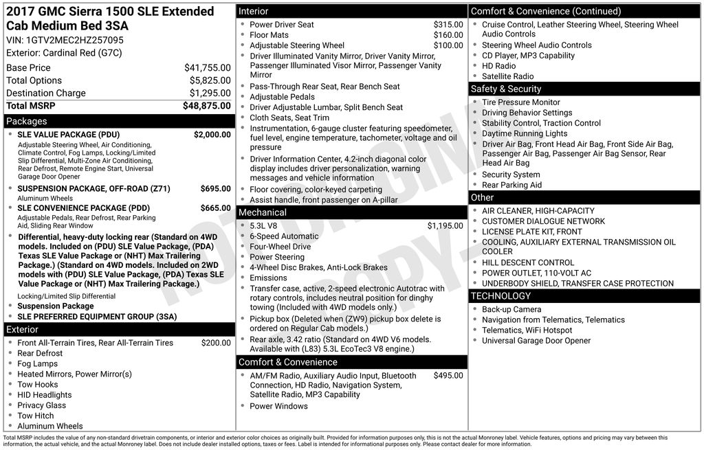 2017 GMC Sierra 1500 SLE Cardinal Red SLE 4WD 6-Speed Automatic Electronic with Overdrive EcoTec3 5.3L V8 6-Speed Automatic Electronic with Overdrive, 4WD, Black Cloth, 10-Way Power Driver's Seat Adjuster, 110-Volt AC Power Outlet, 150 Amp Alternator, 2-Speed Active Electronic AutoTrac Transfer Case, 3.42 Rear Axle Ratio, 4-Wheel Disc Brakes, 4.2" Diagonal Color Display Driver Info Center, 40/20/40 Front Split Bench Seat, 6 Speakers, 6-Speaker Audio System, ABS brakes, Air Conditioning, Alloy wheels, AM/FM radio, Auxiliary External Transmission Oil Cooler, Body Color Bodyside Moldings, Body Color Door Handles, Body Color Power Adjustable Heated Outside Mirrors, Body-Color Mirror Caps, Bodyside moldings, Brake assist, Bumpers: chrome, CD player, Cloth Seat Trim, Color-Keyed Carpeting, Compass, Deep-Tinted Glass, Delay-off headlights, Driver & Front Passenger Illuminated Vanity Mirrors, Driver door bin, Driver vanity mirror, Dual front impact airbags, Dual front side impact airbags, Dual-Zone Automatic Climate Control, Electric Rear-Window Defogger, Electronic Stability Control, Emergency communication system: OnStar Guidance, Exterior Parking Camera Rear, EZ Lift & Lower Tailgate, Front & Rear All-Weather Floor Mats, Front anti-roll bar, Front Center Armrest w/Storage, Front Frame-Mounted Black Recovery Hooks, Front License Plate Kit, Front reading lights, Front wheel independent suspension, Fully automatic headlights, HD Radio, Heated door mirrors, Heavy Duty Suspension, Heavy-Duty Rear Locking Differential, High-Intensity Discharge Headlights, Hill Descent Control, Illuminated entry, Leather Wrapped Steering Wheel w/Cruise Controls, LED Cargo Box Lighting, Low tire pressure warning, Manual Tilt/Telescoping Steering Column, Occupant sensing airbag, Off-Road Suspension Package, OnStar 3 Month Guidance Plan, OnStar w/4G LTE, Outside temperature display, Overhead airbag, Overhead console, Panic alarm, Passenger door bin, Passenger vanity mirror, Power Adjustable Pedals, Power door mirrors, Power Sliding Rear Window w/Defogger, Power steering, Power windows, Power Windows w/Driver Express Up & Down, Preferred Equipment Group 3SA, Radio data system, Radio: AM/FM Stereo w/8" Diagonal Color Touch Nav., Radio: AM/FM Stereo w/8" Diagonal Color Touch Screen, Rear 60/40 Folding Bench Seat (Folds Up), Rear reading lights, Rear step bumper, Rear Vision Camera, Rear Wheelhouse Liners, Remote Keyless Entry, Remote keyless entry, Remote Locking Tailgate, Remote Vehicle Starter System, Rubberized-Vinyl Front Floor Mats, Rubberized-Vinyl Rear Floor Mats, Single Slot CD/MP3 Player, Single-Zone Air Conditioning, SiriusXM Satellite Radio, SLE Convenience Package, SLE Value Package, Speed control, Speed-sensing steering, Split folding rear seat, Steering Wheel Audio Controls, Steering wheel mounted audio controls, Tachometer, Theft Deterrent System (Unauthorized Entry), Thin Profile LED Fog Lamps, Tilt steering wheel, Traction control, Trailering Equipment, Trip computer, Ultrasonic Rear Park Assist, Universal Home Remote, Variably intermittent wipers, Voltmeter, Wheels: 17" x 8" Bright Machined Aluminum, Wheels: 18" x 8.5" Bright Machined Aluminum, 6-Speed Automatic Electronic with Overdrive, 4WD, Black Cloth.