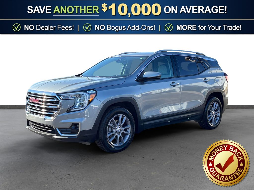 2024 GMC Terrain SLT Sterling Metallic SLT AWD 9-Speed Automatic 1.5L DOHC AWD, 2 USB Data Ports, 2 USB Data Ports w/SD Card Reader, 3.47 Final Drive Axle Ratio, 4-Wheel Disc Brakes, 6 Speakers, 6-Speaker Audio System Feature, 6-Way Power Front Passenger Seat, 8-Way Power Driver Seat Adjuster, ABS brakes, Adaptive Cruise Control, Air Conditioning, Alloy wheels, AM/FM radio: SiriusXM, Auto High-beam Headlights, Auto-dimming Rear-View mirror, Automatic temperature control, Bluetooth® For Phone, Brake assist, Bumpers: body-color, Compass, Delay-off headlights, Driver & Front Passenger Heated Seats, Driver door bin, Driver vanity mirror, Dual front impact airbags, Dual front side impact airbags, Electronic Stability Control, Emergency communication system: OnStar and GMC connected services capable, Four wheel independent suspension, Front & Rear Park Assist, Front anti-roll bar, Front Bucket Seats, Front Center Armrest, Front dual zone A/C, Front fog lights, Front Passenger 2-Way Power Lumbar, Front reading lights, Fully automatic headlights, Garage door transmitter, GMC Pro Safety Plus, HD Surround Vision, Head-Up Display, Heated door mirrors, Heated front seats, Heated steering wheel, Illuminated entry, Lane Change Alert w/Side Blind Zone Alert, Low tire pressure warning, Memory seat, Occupant sensing airbag, Outside temperature display, Overhead airbag, Overhead console, Panic alarm, Passenger door bin, Passenger vanity mirror, Perforated Leather-Appointed Seat Trim, Power door mirrors, Power Driver Lumbar Control, Power driver seat, Power Liftgate, Power passenger seat, Power steering, Power windows, Preferred Equipment Group 4SA, Radio data system, Radio: GMC Infotainment Audio System w/8" Display, Rear anti-roll bar, Rear Cross-Traffic Alert, Rear Park Assist, Rear seat center armrest, Rear window defroster, Rear window wiper, Remote keyless entry, Roof rack: rails only, Safety Alert Seat, Security system, SiriusXM, Speed control, Speed-sensing steering, Split folding rear seat, Spoiler, Steering wheel mounted audio controls, Tachometer, Tech Package, Telescoping steering wheel, Tilt steering wheel, Traction control, Trip computer, Turn signal indicator mirrors, Variably intermittent wipers, Wheels: 18" x 7" Silver Painted Aluminum, Wireless Apple CarPlay/Wireless Android Auto, AWD.