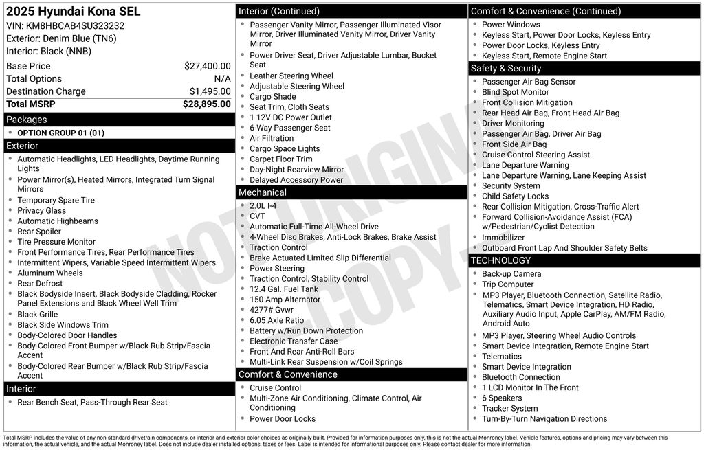 4-Wheel Disc Brakes, 6 Speakers, ABS brakes, Air Conditioning, Alloy wheels, AM/FM radio: SiriusXM, Apple CarPlay & Android Auto, Auto High-beam Headlights, Automatic temperature control, Brake assist, Bumpers: body-color, Cloth Seat Trim, Delay-off headlights, Driver door bin, Driver vanity mirror, Dual front impact airbags, Dual front side impact airbags, Electronic Stability Control, Emergency communication system: Bluelink+, Exterior Parking Camera Rear, Four wheel independent suspension, Front anti-roll bar, Front Bucket Seats, Front Center Armrest, Front dual zone A/C, Front reading lights, Fully automatic headlights, Heated door mirrors, Illuminated entry, Leather steering wheel, Low tire pressure warning, Occupant sensing airbag, Option Group 01, Outside temperature display, Overhead airbag, Panic alarm, Passenger door bin, Passenger vanity mirror, Power door mirrors, Power driver seat, Power steering, Power windows, Radio: AM/FM/HD Radio/SiriusXM Audio System, Rear anti-roll bar, Rear seat center armrest, Rear window defroster, Rear window wiper, Remote keyless entry, Security system, Speed control, Speed-sensing steering, Split folding rear seat, Spoiler, Steering wheel mounted audio controls, Tachometer, Telescoping steering wheel, Tilt steering wheel, Traction control, Trip computer, Turn signal indicator mirrors, Variably intermittent wipers, Wheels: 18" x 7.0J Glossy Black Alloy. 2025 Hyundai Kona SEL