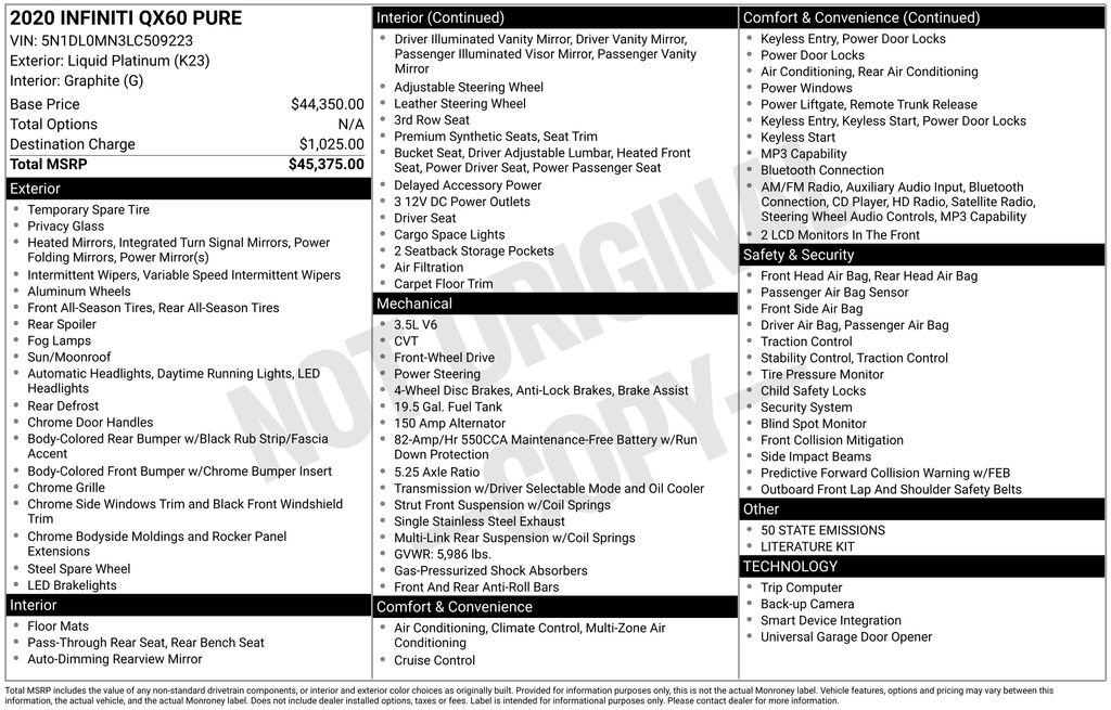 3rd row seats: bench, 4-Wheel Disc Brakes, 5.25 Axle Ratio, 6 Speakers, ABS brakes, Air Conditioning, Alloy wheels, AM/FM radio: SiriusXM, Anti-whiplash front head restraints, Auto-dimming Rear-View mirror, Automatic temperature control, Blind Spot Warning, Bodyside moldings, Brake assist, Bumpers: body-color, Carpeted Floor Mats (4-Piece Set), CD player, Delay-off headlights, Driver door bin, Driver vanity mirror, Dual front impact airbags, Dual front side impact airbags, Electronic Stability Control, Four wheel independent suspension, Front anti-roll bar, Front Bucket Seats, Front Center Armrest w/Storage, Front dual zone A/C, Front fog lights, Front reading lights, Fully automatic headlights, Garage door transmitter: HomeLink, Heated door mirrors, Heated Front Seats, Heated front seats, Illuminated entry, Leather steering wheel, Leatherette Seat Trim, Literature Kit, Low tire pressure warning, Occupant sensing airbag, Outside temperature display, Overhead airbag, Overhead console, Panic alarm, Passenger door bin, Passenger vanity mirror, Power door mirrors, Power driver seat, Power Liftgate, Power moonroof, Power passenger seat, Power steering, Power windows, Radio data system, Radio: AM/FM/CD/HD/MP3 Audio System, Rear air conditioning, Rear anti-roll bar, Rear reading lights, Rear seat center armrest, Rear window defroster, Rear window wiper, Reclining 3rd row seat, Remote keyless entry, Security system, Speed control, Speed-sensing steering, Speed-Sensitive Wipers, Split folding rear seat, Spoiler, Steering wheel mounted audio controls, Tachometer, Telescoping steering wheel, Tilt steering wheel, Traction control, Trip computer, Turn signal indicator mirrors, Variably intermittent wipers, Wheels: 18" Triple 5-Spoke Aluminum-Alloy. 2020 INFINITI QX60 PURE