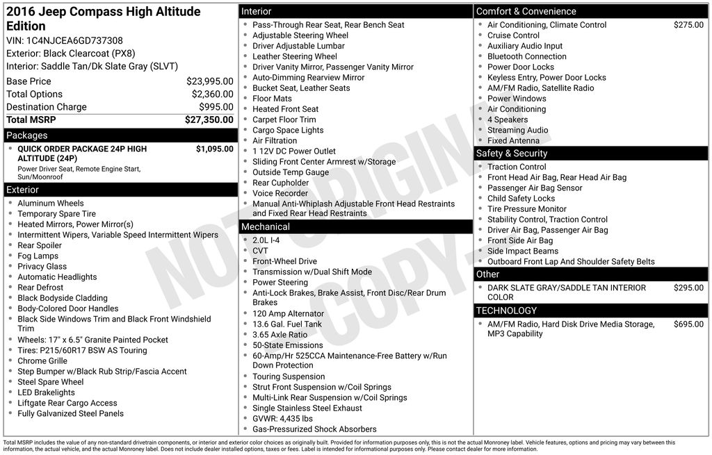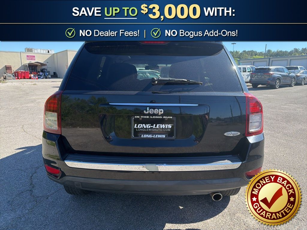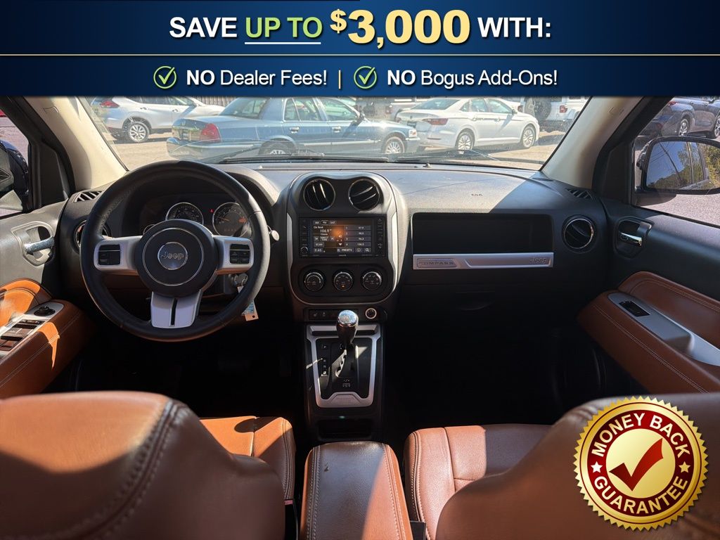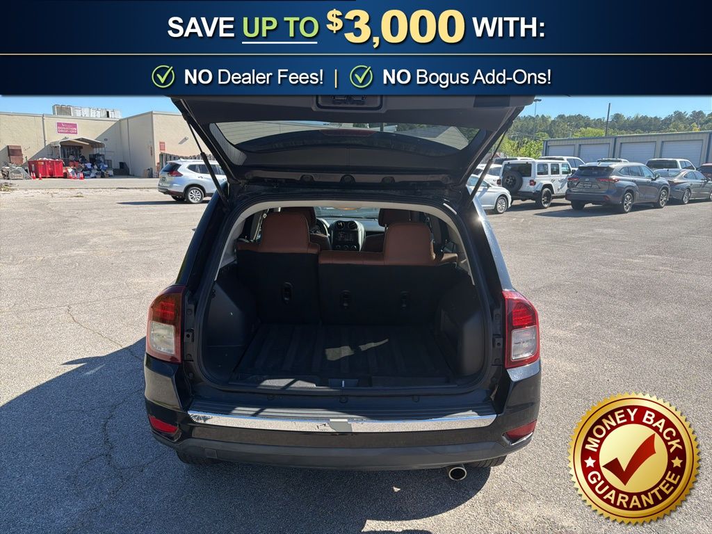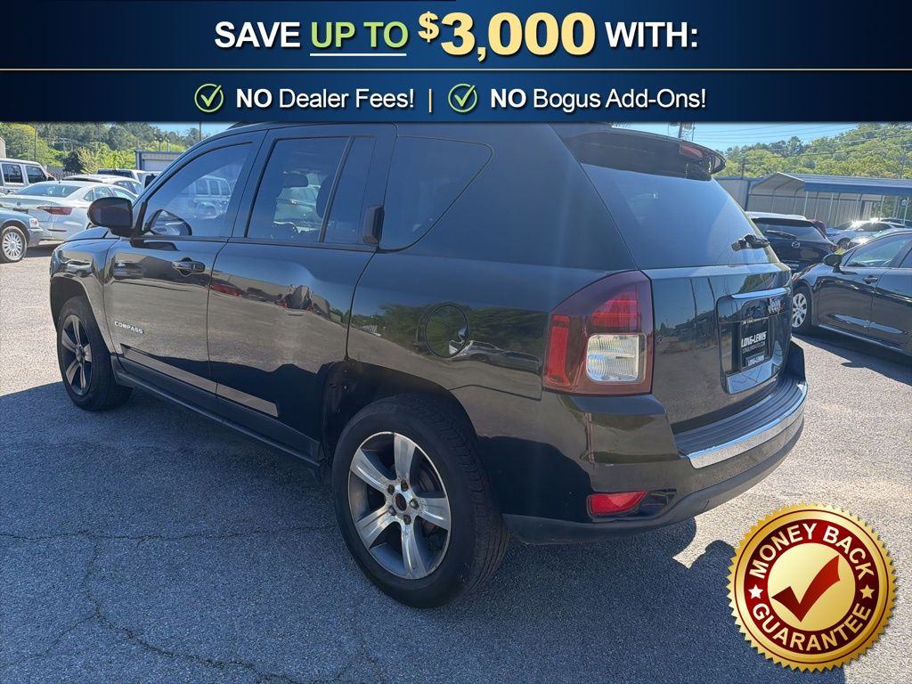 16" x 6.5" Aluminum Wheels, 3.65 Axle Ratio, 4 Speakers, ABS brakes, Air Conditioning, Air Conditioning w/Auto Temperature Control, Alloy wheels, AM/FM radio: SiriusXM, Anti-whiplash front head restraints, Audio Jack Input for Mobile Devices, Auto-dimming Rear-View mirror, Body Color Fascias w/Bright Insert, Brake assist, Bright Exhaust Tip, Bright Side Roof Rails, Bumpers: body-color, CD player, Cloth/Vinyl Low-Back Bucket Seats, Dark Slate Gray/Saddle Tan Interior Color, Driver door bin, Driver vanity mirror, Dual front impact airbags, Dual front side impact airbags, Electronic Stability Control, Four wheel independent suspension, Front anti-roll bar, Front Bucket Seats, Front Center Armrest w/Storage, Front fog lights, Front reading lights, Fully automatic headlights, Heated door mirrors, Heated front seats, Illuminated entry, Leather Trimmed Bucket Seats, Low tire pressure warning, Manual Driver Lumbar Adjust, Occupant sensing airbag, Outside temperature display, Overhead airbag, Panic alarm, Passenger door bin, Passenger vanity mirror, Power 6-Way Driver Seat, Power door mirrors, Power Express Open/Close Sunroof, Power steering, Power windows, Quick Order Package 24P High Altitude, Radio: 130, Radio: 430, Rear anti-roll bar, Rear window defroster, Rear window wiper, Remote keyless entry, Remote Start System, Roof rack: rails only, Speed control, Split folding rear seat, Spoiler, Steering wheel mounted audio controls, Tachometer, Tilt steering wheel, Traction control, Variably intermittent wipers, Wheels: 17" x 6.5" Granite Painted Pocket. 2016 Jeep Compass Latitude