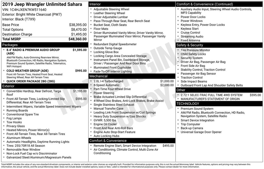 1-Year SiriusXM Guardian Trial, 3.45 Rear Axle Ratio, 4-Wheel Disc Brakes, 4G LTE Wi-Fi Hot Spot, 5-Year SiriusXM Traffic Service, 5-Year SiriusXM Travel Link Service, 8 Speakers, 8.4" Radio & Premium Audio Group, 8.4" Touchscreen Display, ABS brakes, Air Conditioning, Alloy wheels, Alpine Premium Audio System, AM/FM radio: SiriusXM, Anti-Spin Differential Rear Axle, Apple CarPlay/Android Auto, Auto-Dimming Rear-View Mirror, Automatic temperature control, Black 3-Piece Hard Top, Brake assist, Cloth Low-Back Bucket Seats, Cold Weather Group, Compass, Delay-off headlights, Driver door bin, Driver vanity mirror, Dual front impact airbags, Dual front side impact airbags, Electronic Stability Control, Emergency/Assistance Call, For Details, Visit DriveUconnect.ca, Freedom Panel Storage Bag, Front anti-roll bar, Front Bucket Seats, Front Center Armrest w/Storage, Front dual zone A/C, Front fog lights, Front reading lights, Fully automatic headlights, Garage door transmitter, GPS Navigation, HD Radio, Heated door mirrors, Heated Front Seats, Heated Steering Wheel, Heavy Duty Suspension w/Gas Shocks, Illuminated entry, Integrated roll-over protection, Leather steering wheel, Low tire pressure warning, Manufacturer's Statement of Origin (DISC), No Soft Top, Non-Lock Fuel Cap w/o Discriminator, Occupant sensing airbag, Outside temperature display, Panic alarm, ParkView Rear Back-Up Camera, Passenger door bin, Passenger vanity mirror, Power door mirrors, Power steering, Power windows, Quick Order Package 28G, Radio data system, Radio: Uconnect 4 w/7" Display, Radio: Uconnect 4C Nav w/8.4" Display, Rear anti-roll bar, Rear reading lights, Rear Window Defroster, Rear Window Wiper/Washer, Remote keyless entry, Remote Start System, Security system, SiriusXM Traffic Plus, SiriusXM Travel Link, Speed control, Split folding rear seat, Steering wheel mounted audio controls, Tachometer, Telescoping steering wheel, Tilt steering wheel, Traction control, Trip computer, Variably intermittent wipers, Voltmeter, Wheels: 18" x 7.5" Polished w/Gray Spokes. 2019 Jeep Wrangler Unlimited Sahara