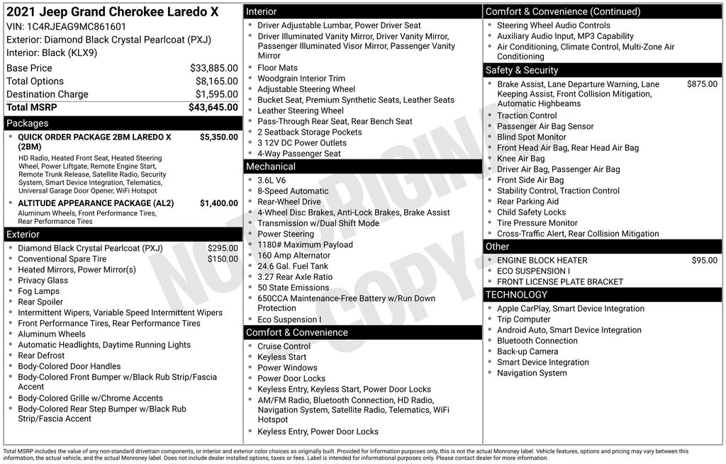 2021 Jeep Grand Cherokee Laredo X Diamond Black Crystal Pearlcoat Laredo X RWD 8-Speed Automatic 3.6L V6 24V VVT 1-Year SiriusXM Guardian Trial, 3.27 Rear Axle Ratio, 4-Wheel Disc Brakes, 4G LTE Wi-Fi Hot Spot, 5-Year SiriusXM Traffic Service, 5-Year SiriusXM Travel Link Service, 6 Speakers, 8.4" Touchscreen Display, ABS brakes, Advanced Brake Assist, Air Conditioning, Alloy wheels, Altitude Appearance Package, Altitude Grille, AM/FM radio: SiriusXM, Anti-whiplash front head restraints, Apple CarPlay, Apple CarPlay/Android Auto, Auto High Beam Headlamp Control, Automatic temperature control, Black Roof Molding, Black Suede Seats w/Black Stitching, Body Color Claddings, Body Color Fascia, Body Color Shark Fin Antenna, Brake assist, Bridgestone Brand Tires, Bumpers: body-color, Cloth Bucket Seats, Compass, Dark Day Light Opening Moldings, Dark Headlamp Bezel Finish, Dark Lens Taillamps, Delay-off headlights, Delete Laredo Badge, Driver door bin, Driver vanity mirror, Dual front impact airbags, Dual front side impact airbags, Eco Suspension I, Electronic Stability Control, Engine Block Heater, Four wheel independent suspension, Front Accent/Body Color Fascia, Front anti-roll bar, Front Bucket Seats, Front Center Armrest w/Storage, Front dual zone A/C, Front fog lights, Front License Plate Bracket, Front reading lights, Full Speed FWD Collision Warn Plus, Fully automatic headlights, Gloss Black Jeep Badging, Gloss Black Rear Fascia Applique, Google Android Auto, GPS Antenna Input, GPS Navigation, HD Radio, Heated door mirrors, Heated Front Seats, Heated Steering Wheel, Illuminated entry, Integrated Voice Command w/Bluetooth, Knee airbag, Lane Departure Warning Plus, Leather Shift Knob, Low tire pressure warning, Occupant sensing airbag, Outside temperature display, Overhead airbag, Overhead console, Panic alarm, ParkView Rear Back-Up Camera, Passenger door bin, Passenger vanity mirror, Power door mirrors, Power driver seat, Power Liftgate, Power steering, Power windows, Protech II, Quick Order Package 2BM Laredo X, Radio data system, Radio: Uconnect 4 w/7" Display, Radio: Uconnect 4C Nav w/8.4" Display, Rear Accent/Body Color Fascia, Rear anti-roll bar, Rear Fascia Black Molded in Color Step Pad, Rear reading lights, Rear seat center armrest, Rear window defroster, Rear window wiper, Remote keyless entry, Remote Start System, Roof rack: rails only, Security Alarm, Single Exhaust w/Bright Tip, SiriusXM Satellite Radio, SiriusXM Traffic Plus, SiriusXM Travel Link, Speed control, Speed-sensing steering, Speed-Sensitive Wipers, Split folding rear seat, Spoiler, Steering Wheel Mounted Audio Controls, Steering wheel mounted audio controls, Tachometer, Telescoping steering wheel, Tilt steering wheel, Traction control, Trip computer, Universal Garage Door Opener, Variably intermittent wipers, Wheels: 18" x 8.0" Fine Silver Aluminum, Wheels: 20" x 8.0" Gloss Black Aluminum.