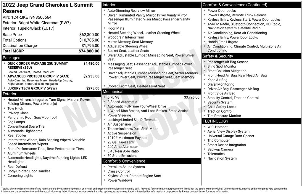 2022 Jeep Grand Cherokee L Summit 4WD 8-Speed Automatic HEMI 5.7L V8 Multi Displacement VVT Bright White Clearcoat