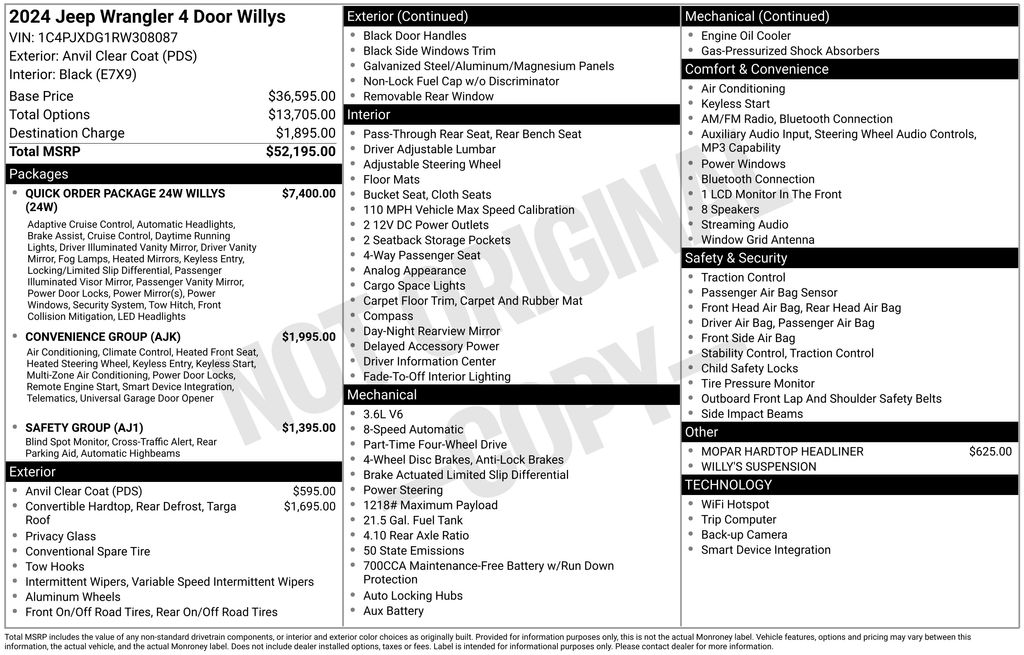 2024 Jeep Wrangler Willys Anvil Clear Coat Willys 4WD 8-Speed Automatic 3.6L V6 24V VVT 110 MPH Vehicle Max Speed Calibration, 2-Door Passive Entry, Front Door Locks, 240 Amp Alternator, 4-Wheel Disc Brakes, 4-Wheel Drive Swing Gate Decal, 7 & 4 Pin Wiring Harness, 8 Speakers, 97 MPH Vehicle Max Speed Calibration, ABS brakes, Advanced Brake Assist, Air Conditioning, Air Conditioning w/Auto Temperature Control, Air Filtering, AM/FM radio, Apple CarPlay/Android Auto, Auto High Beam Headlamp Control, Automatic Headlamps, Aux Battery, Auxiliary Switches, Black 3-Piece Hard Top, Black Grille, Blind Spot & Cross Path Detection, Brake assist, Class II Receiver Hitch, Cloth Low-Back Bucket Seats, Cluster 7.0" TFT Color Display, Compass, Convenience Group, Conventional Differential Front Axle, Corning Gorilla Glass, Dana M210 Wide HD Tube Front Axle, Dana M220 Wide Rear Axle, Daytime Running Lamps LED Accents, Deep Tint Sunscreen Windows, Delay-off headlights, Driver door bin, Driver vanity mirror, Dual front impact airbags, Dual front side impact airbags, E-Locker Rear Axle, Electronic Stability Control, Emergency/Assistance Call, Enhanced Adaptive Cruise Control, Freedom Panel Storage Bag, Front 1-Touch Down Power Windows, Front anti-roll bar, Front Bucket Seats, Front Center Armrest w/Storage, Front fog lights, Front LED Fog Lamps, Front reading lights, Full Speed Forward Collision Warning Plus, Heated Front Seats, Heated Steering Wheel, Injection Molded Black Rear Bumper, Integrated roll-over protection, LED Premium Reflector Headlamps, LED Taillamps, Low tire pressure warning, Mold In Color Bumper w/Gloss Black, Molded in Color Rubicon Highline Flare, MOPAR All-Weather Floor Mats, MOPAR Hardtop Headliner, No Soft Top, Non-Lock Fuel Cap w/o Discriminator, Normal Duty Suspension, Occupant sensing airbag, Off-Road Plus Mode, Outside temperature display, Overhead airbag, ParkSense Rear Park Assist System, ParkView Rear Back-Up Camera, Passenger door bin, Passenger vanity mirror, Power Heated Mirrors, Power steering, Premium Wrapped Steering Wheel, Quick Order Package 24W Willys, Radio data system, Radio: Uconnect 5 w/12.3" Display, Rear anti-roll bar, Rear reading lights, Rear Window Defroster, Rear Window Wiper/Washer, Remote Keyless Entry, Remote Start System, Safety Group, Security Alarm, Speed control, Speed Sensitive Power Locks, Split folding rear seat, Steering wheel mounted audio controls, Stop-Start Dual Battery System, Sun Visors w/Illuminated Vanity Mirrors, Tachometer, Telescoping steering wheel, Tilt steering wheel, Traction control, Trip computer, Universal Garage Door Opener, Variably intermittent wipers, Wheels: 17" x 7.5" Black Steel Styled, Wheels: 17" x 7.5" Painted Black, Willy's Suspension, Willys, Willys Hood Decal.