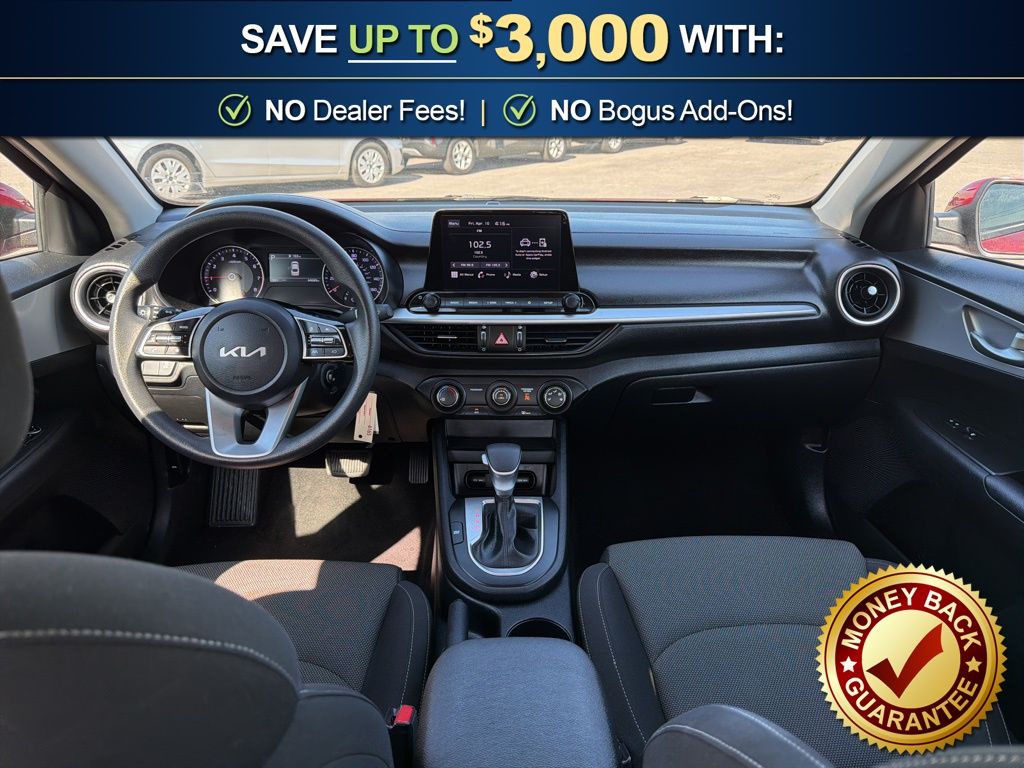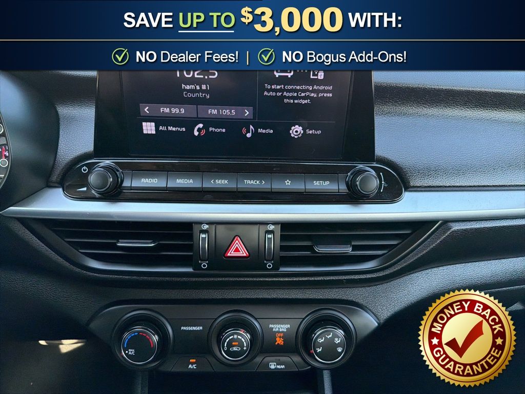16" x 6.5J Alloy Wheels, 4 Speakers, 4-Wheel Disc Brakes, ABS brakes, Air Conditioning, Alloy wheels, AM/FM radio, Apple CarPlay & Android Auto, Auto High-beam Headlights, Brake assist, Bumpers: body-color, Carpet Floor Mats, Cloth Seat Trim, Delay-off headlights, Driver door bin, Driver vanity mirror, Dual front impact airbags, Dual front side impact airbags, Electronic Stability Control, Exterior Parking Camera Rear, Front anti-roll bar, Front Bucket Seats, Front Center Armrest, Front reading lights, Front wheel independent suspension, Fully automatic headlights, Illuminated entry, Low tire pressure warning, Occupant sensing airbag, Outside temperature display, Overhead airbag, Overhead console, Panic alarm, Passenger door bin, Passenger vanity mirror, Power door mirrors, Power steering, Power windows, Radio data system, Radio: 8" Display Audio, Rear window defroster, Remote keyless entry, Security system, Speed control, Split folding rear seat, Steering wheel mounted audio controls, Tachometer, Telescoping steering wheel, Tilt steering wheel, Traction control, Trip computer, Variably intermittent wipers. 2023 Kia Forte LXS