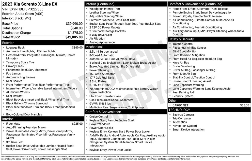 2023 Kia Sorento X-Line EX AWD 8-Speed DCT 2.5L I4 DGI Turbocharged DOHC 16V LEV3-ULEV70 281hp Aruba Green