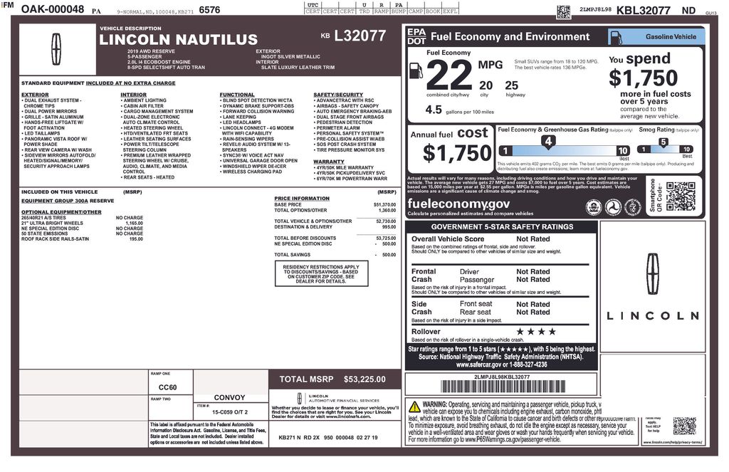 13 Speakers, 3.80 Axle Ratio, 4-Wheel Disc Brakes, ABS brakes, Adaptive suspension, Air Conditioning, Alloy wheels, AM/FM radio: SiriusXM, AppLink/Apple CarPlay and Android Auto, Auto High-beam Headlights, Auto tilt-away steering wheel, Auto-dimming door mirrors, Auto-dimming Rear-View mirror, Automatic temperature control, Brake assist, Bumpers: body-color, CD player, Compass, Delay-off headlights, Driver door bin, Driver vanity mirror, Dual front impact airbags, Dual front side impact airbags, Electronic Stability Control, Emergency communication system: 911 Assist, Equipment Group 300A, Exterior Parking Camera Rear, Four wheel independent suspension, Front anti-roll bar, Front Bucket Seats, Front Center Armrest w/Storage, Front dual zone A/C, Front fog lights, Front reading lights, Fully automatic headlights, Garage door transmitter: HomeLink, Genuine wood console insert, Genuine wood door panel insert, Heated door mirrors, Heated front seats, Heated rear seats, Heated steering wheel, Illuminated entry, Knee airbag, Leather steering wheel, Low tire pressure warning, Memory seat, Navigation System, Occupant sensing airbag, Outside temperature display, Overhead airbag, Overhead console, Panic alarm, Passenger door bin, Passenger vanity mirror, Power door mirrors, Power driver seat, Power Liftgate, Power moonroof: Panoramic Vista Roof, Power passenger seat, Power steering, Power windows, Prem Lthr-Trimmed Heated/Cooled Bucket Seats, Radio data system, Radio: Revel Audio w/Single-CD, HD & Nav, Rain sensing wipers, Rear anti-roll bar, Rear reading lights, Rear seat center armrest, Rear window defroster, Rear window wiper, Remote keyless entry, Satin Roof Rack Side Rails w/o Crossbars, Security system, Speed control, Speed-sensing steering, Speed-Sensitive Wipers, Split folding rear seat, Spoiler, Steering wheel memory, Steering wheel mounted A/C controls, Steering wheel mounted audio controls, SYNC 3 Communications & Entertainment System, Tachometer, Telescoping steering wheel, Tilt steering wheel, Traction control, Trip computer, Turn signal indicator mirrors, Variably intermittent wipers, Ventilated front seats, Voice-Activated Touchscreen Navigation System, Wheels: 20" Prem Painted Bright Machined Alum, Wheels: 21" Premium Painted Ultra Bright Mach Alum. 2019 Lincoln Nautilus Reserve