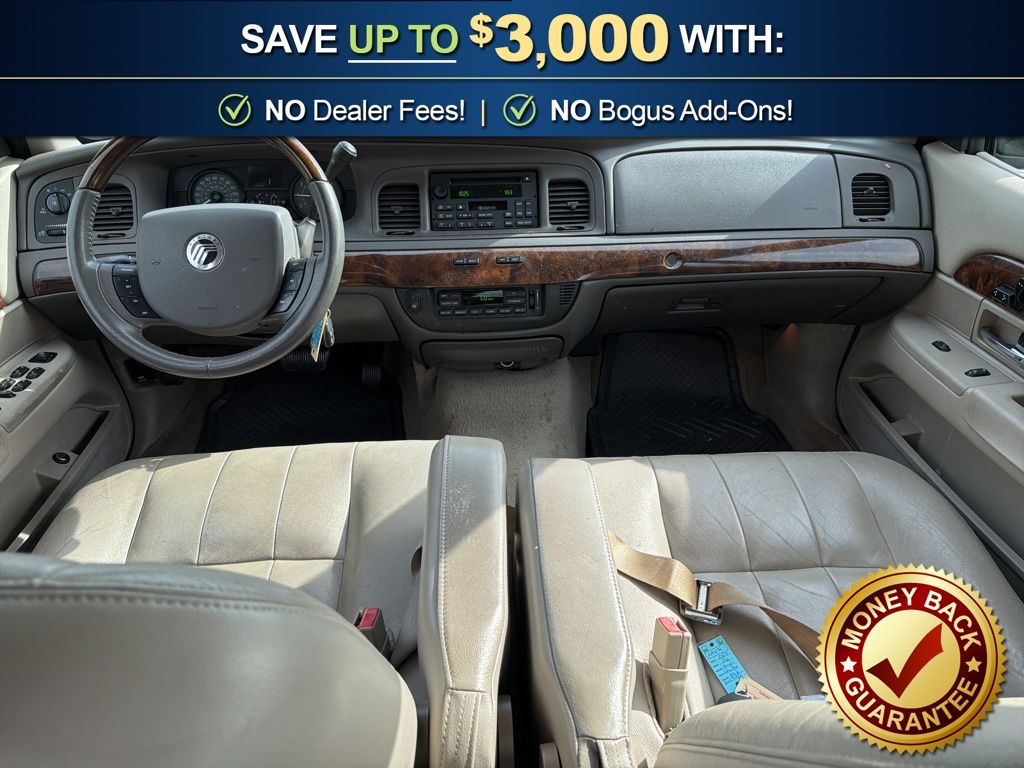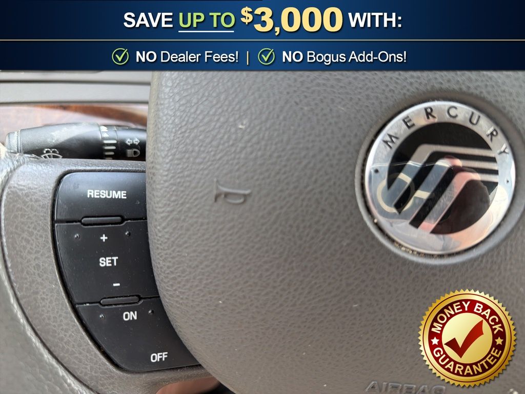 16" 16-Spoke Painted Aluminum Wheels, 4 Speakers, 4-Wheel Disc Brakes, ABS brakes, Adjustable pedals, Air Conditioning, Alloy wheels, AM/FM radio, AM/FM Stereo w/Single CD, Auto-dimming Rear-View mirror, Automatic temperature control, Bodyside moldings, Brake assist, Bumpers: body-color, CD player, Compass, Delay-off headlights, Driver door bin, Driver vanity mirror, Dual front impact airbags, Front anti-roll bar, Front fog lights, Front reading lights, Front wheel independent suspension, Fully automatic headlights, Garage door transmitter, Heated door mirrors, Illuminated entry, Leather steering wheel, Leather Twin Comfort Seats, Occupant sensing airbag, Outside temperature display, Overhead console, Panic alarm, Passenger door bin, Passenger vanity mirror, Power door mirrors, Power driver seat, Power passenger seat, Power steering, Power windows, Rear reading lights, Rear seat center armrest, Rear window defroster, Remote keyless entry, Speed control, Speed-sensing steering, Tachometer, Tilt steering wheel, Traction control, Trip computer, Variably intermittent wipers. 2007 Mercury Grand Marquis LS