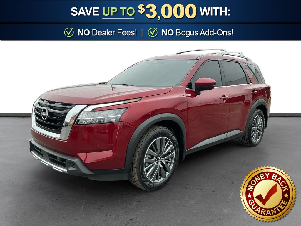 2024 Nissan Pathfinder SL Scarlet Ember SL FWD 9-Speed Automatic 3.5L V6 DOHC 20" Painted Alloy Wheels, 2nd-Row Captain Chairs, 2nd-Row Rear Headrest, 3rd row seats: bench, 4-Wheel Disc Brakes, 6 Speakers, ABS brakes, Air Conditioning, Alloy wheels, AM/FM radio: SiriusXM, Auto High-beam Headlights, Auto-dimming Rear-View mirror, Automatic temperature control, Axle Ratio: 4.334, Black Splash Guards (Set of 4), Bose Premium Audio System, Brake assist, Bumpers: body-color, Captain's Chairs Carpeted Floor Mats (Set of 4), Cross Bars, Delay-off headlights, Driver door bin, Driver vanity mirror, Dual front impact airbags, Dual front side impact airbags, Electronic Stability Control, Emergency communication system, Exterior Parking Camera Rear, Four wheel independent suspension, Front anti-roll bar, Front Bucket Seats, Front Center Armrest, Front dual zone A/C, Front reading lights, Fully automatic headlights, Garage door transmitter: HomeLink, Heated door mirrors, Heated Front Bucket Seats, Heated front seats, Heated Rear Seats, Heated steering wheel, Illuminated entry, Knee airbag, Leather steering wheel, Leather-Appointed Seating Surfaces, Low tire pressure warning, Navigation system: NissanConnect with Navigation and Services, NissanConnect featuring Apple CarPlay and Android Auto, NissanConnect w/Navigation & Services, Occupant sensing airbag, Outside temperature display, Overhead airbag, Overhead console, Panic alarm, Panoramic Moonroof, Passenger door bin, Passenger vanity mirror, Power door mirrors, Power driver seat, Power Liftgate, Power passenger seat, Power steering, Power windows, Radio data system, Radio: AM/FM Audio System, Rear air conditioning, Rear anti-roll bar, Rear reading lights, Rear seat center armrest, Rear side impact airbag, Rear window defroster, Rear window wiper, Reclining 3rd row seat, Remote keyless entry, Security system, SL Premium Package, Speed control, Speed-sensing steering, Split folding rear seat, Spoiler, Steering wheel mounted audio controls, Tachometer, Telescoping steering wheel, Tilt steering wheel, Tow Hitch Receiver & Harness, Traction control, Trip computer, Turn signal indicator mirrors, Variably intermittent wipers, Wheels: 18" x 8J Machined Alloy.