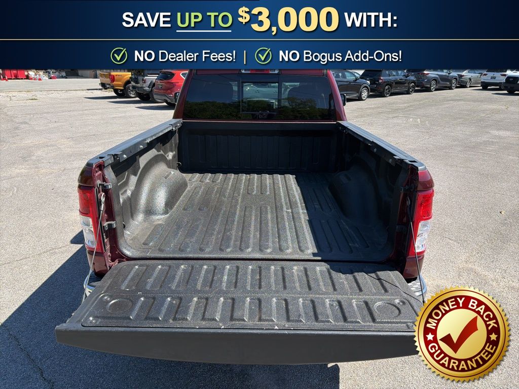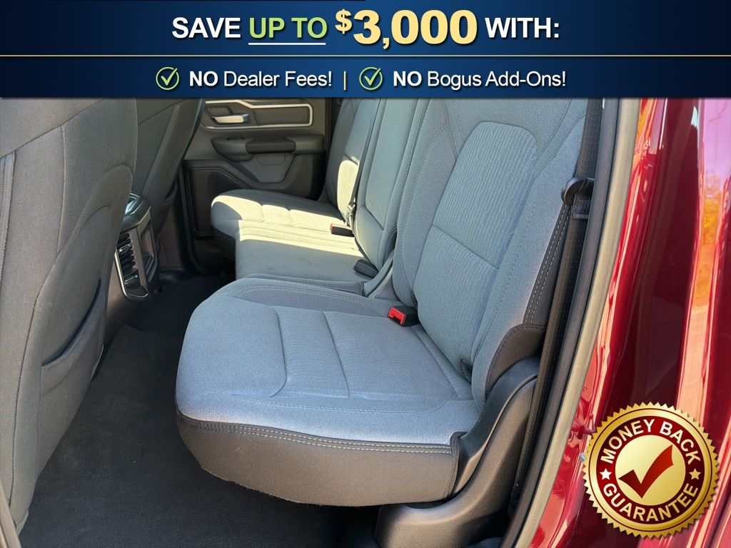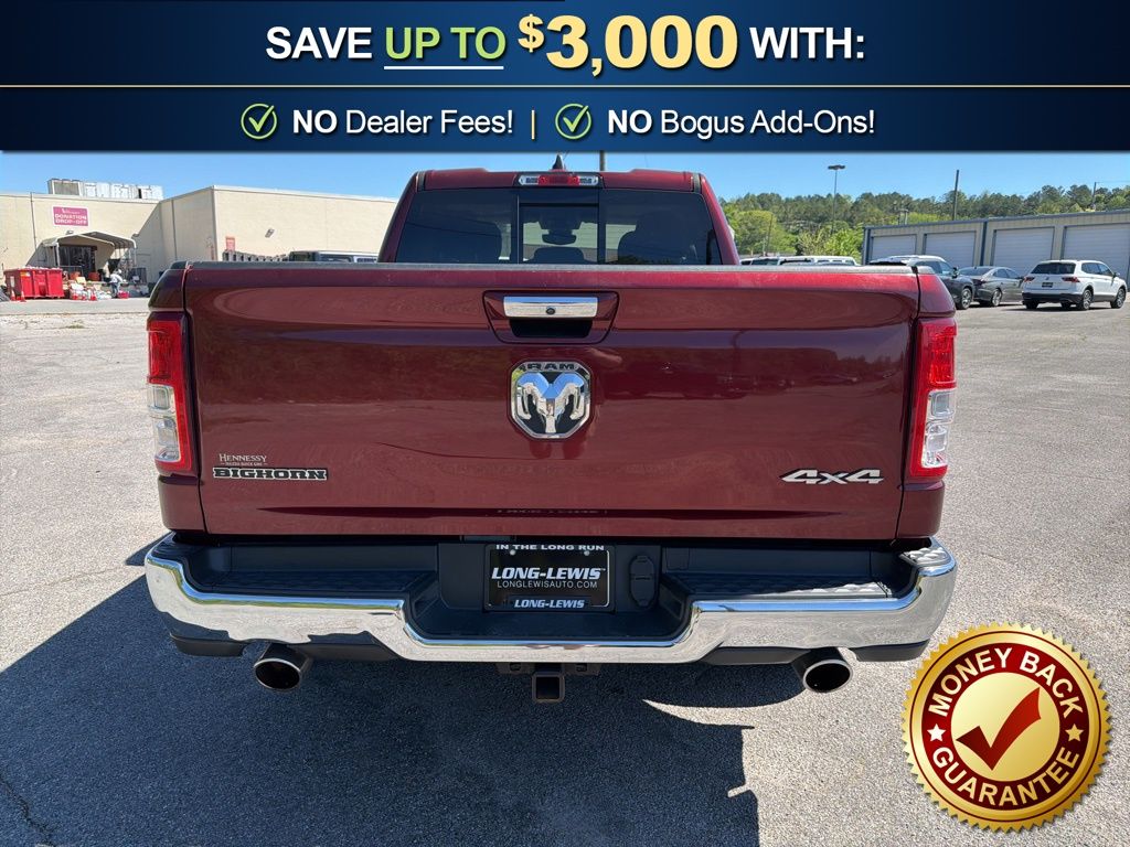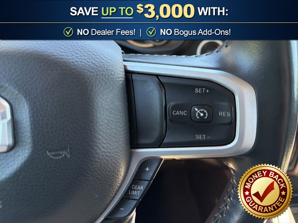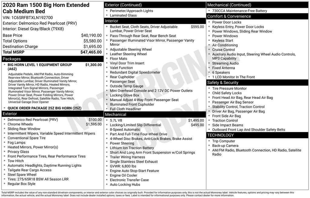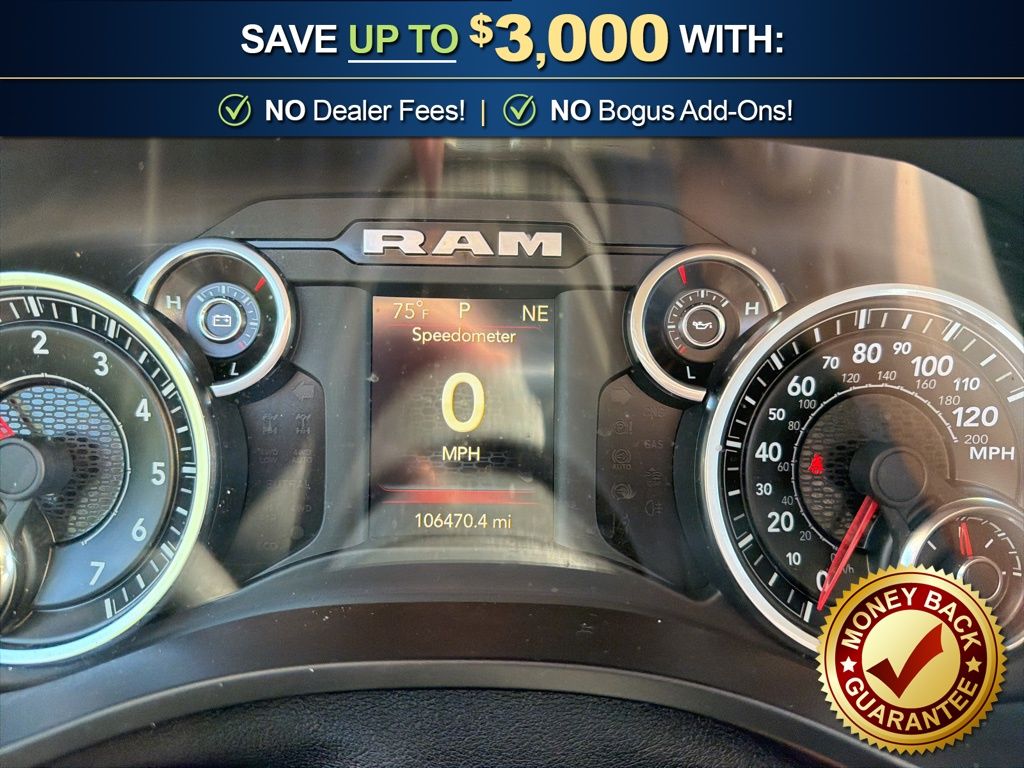 3 Rear Seat Head Restraints, 3.21 Rear Axle Ratio, 4 Way Front Headrests, 4-Wheel Disc Brakes, 48V Belt Starter Generator, 6 Speakers, ABS brakes, Air Conditioning, Alloy wheels, AM/FM radio, Anti-Spin Differential Rear Axle, Auto-Dimming Rear-View Mirror, Big Horn IP Badge, Big Horn Level 1 Equipment Group, Black Premium Power Mirrors, Brake assist, Bumpers: chrome, Class IV Receiver Hitch, Cloth Bench Seat, Cluster 3.5" TFT Color Display, Compass, Delay-off headlights, Driver door bin, Dual front impact airbags, Dual front side impact airbags, Electronic Stability Control, Foam Bottle Insert (Door Trim Panel), Front anti-roll bar, Front Center Armrest w/Storage, Front fog lights, Front reading lights, Front Seat Back Map Pockets, Front wheel independent suspension, Fully automatic headlights, Glove Box Lamp, GPS Antenna Input, Heated door mirrors, Illuminated entry, Leather steering wheel, Low tire pressure warning, Manual Adjust 4-Way Front Passenger Seat, Occupant sensing airbag, Outside temperature display, Overhead airbag, Overhead console, Panic alarm, ParkView Rear Back-Up Camera, Passenger door bin, Passenger vanity mirror, Power 4-Way Driver Lumbar Adjust, Power 8-Way Driver Seat, Power Adjustable Pedals, Power door mirrors, Power steering, Power windows, Quick Order Package 25Z Big Horn, Radio data system, Radio: Uconnect 3 w/5" Display, Radio: Uconnect 4 w/8.4" Display, Rear 60/40 Folding Seat, Rear anti-roll bar, Rear Dome w/On/Off Switch Lamp, Rear Power Sliding Window, Rear seat center armrest, Rear step bumper, Rear Window Defroster, Remote keyless entry, SiriusXM Satellite Radio, Speed control, Split folding rear seat, Steering wheel mounted audio controls, Sun Visors w/Illuminated Vanity Mirrors, Tachometer, Telescoping steering wheel, Tilt steering wheel, Traction control, Trip computer, Universal Garage Door Opener, Variably intermittent wipers, Voltmeter, Wheels: 18" x 8" Cast-Aluminum Painted, Wheels: 20" x 9" Aluminum Chrome Clad (WRK). 2020 Ram 1500 Big Horn/Lone Star