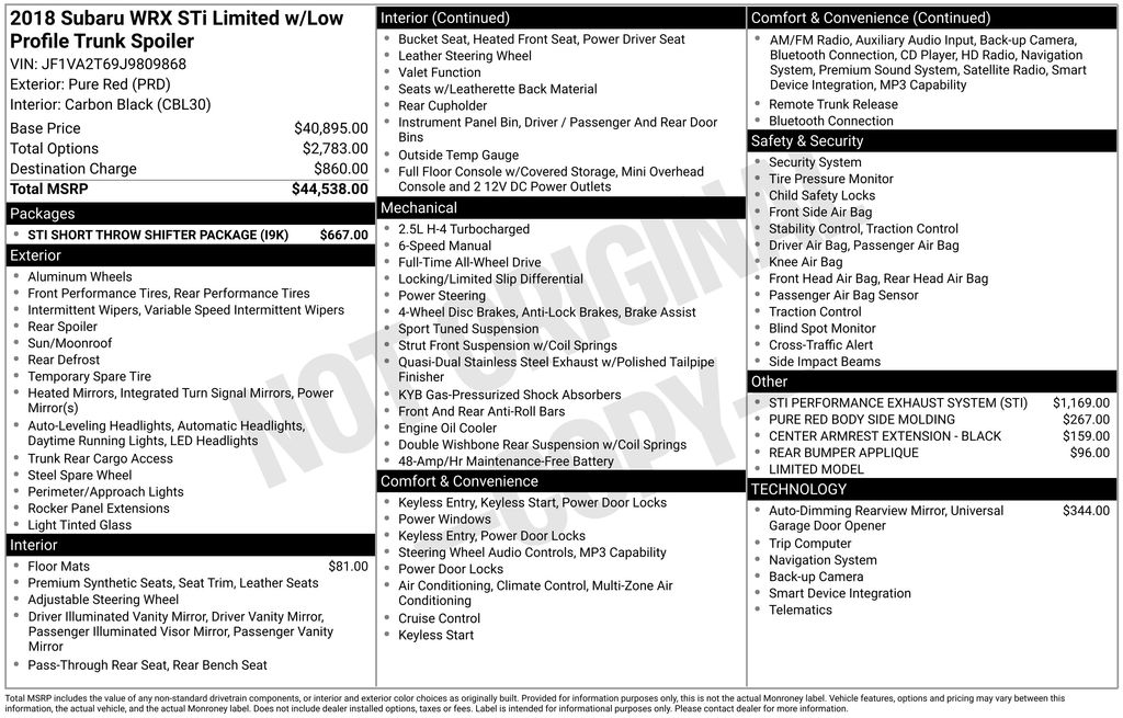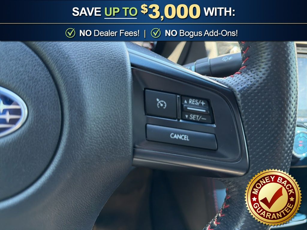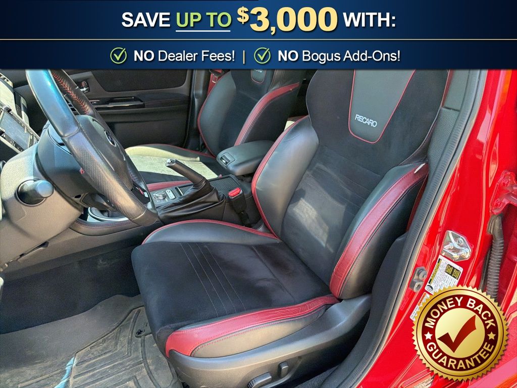 19" Alloy Wheels, 4-Wheel Disc Brakes, 9 Speakers, ABS brakes, Air Conditioning, All Weather Floor Mats, Alloy wheels, AM/FM radio: SiriusXM, Auto-Dimming Mirror w/Compass & HomeLink, Automatic temperature control, Brake assist, Bumpers: body-color, CD player, Center Armrest Extension - Black, Delay-off headlights, Driver door bin, Driver vanity mirror, Dual front impact airbags, Dual front side impact airbags, Electronic Stability Control, Exterior Parking Camera Rear, Four wheel independent suspension, Front anti-roll bar, Front Bucket Seats, Front Center Armrest, Front dual zone A/C, Front fog lights, Front reading lights, Fully automatic headlights, harman/kardon® Speakers, Heated door mirrors, Heated front seats, Illuminated entry, Knee airbag, Leather Shift Knob, Leather steering wheel, Leather-Trimmed Upholstery, Limited Model, Low tire pressure warning, Navigation System, Occupant sensing airbag, Outside temperature display, Overhead airbag, Overhead console, Panic alarm, Passenger door bin, Passenger vanity mirror, Power door mirrors, Power driver seat, Power moonroof, Power steering, Power windows, Pure Red Body Side Molding, Radio data system, Radio: Subaru Starlink 7.0" Multimedia Nav System, Rear anti-roll bar, Rear Bumper Applique, Rear seat center armrest, Rear window defroster, RECARO Performance Design Heated Frt Bucket Seats, Remote keyless entry, Security system, Speed control, Speed-sensing steering, Split folding rear seat, Spoiler, Sport steering wheel, Steering wheel mounted audio controls, STI Performance Exhaust System (STI), STI Shift Knob, STI Short Throw Shifter (STI), STI Short Throw Shifter Package, Tachometer, Telescoping steering wheel, Tilt steering wheel, Traction control, Trip computer, Turn signal indicator mirrors, Variably intermittent wipers. 2018 Subaru WRX STi Limited