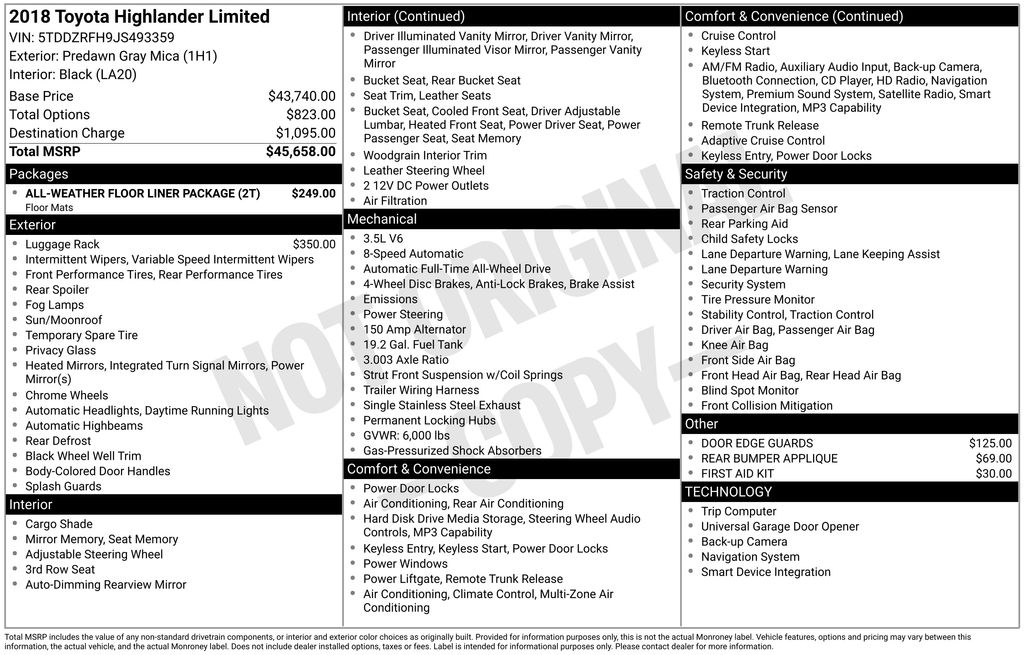 2018 Toyota Highlander Limited Predawn Gray Mica Limited AWD 8-Speed Automatic Electronic with ECT-i 3.5L V6 AWD, 12 Speakers, 3.003 Axle Ratio, 3rd row seats: split-bench, 4-Wheel Disc Brakes, ABS brakes, Air Conditioning, All Weather Floor Liners, All-Weather Floor Liner Package, Alloy wheels, AM/FM radio: SiriusXM, Auto High-beam Headlights, Auto-dimming Rear-View mirror, Automatic temperature control, Brake assist, Bumpers: body-color, Cargo Tray, CD player, Delay-off headlights, Door Edge Guards, Driver door bin, Driver vanity mirror, Dual front impact airbags, Dual front side impact airbags, Electronic Stability Control, Exterior Parking Camera Rear, First Aid Kit, Four wheel independent suspension, Front anti-roll bar, Front Bucket Seats, Front Center Armrest, Front dual zone A/C, Front fog lights, Front reading lights, Fully automatic headlights, Garage door transmitter, Heated door mirrors, Heated front seats, Heated/Ventilated Front Bucket Seats, Illuminated entry, Knee airbag, Leather Shift Knob, Low tire pressure warning, Memory seat, Navigation System, Occupant sensing airbag, Outside temperature display, Overhead airbag, Overhead console, Panic alarm, Passenger door bin, Passenger vanity mirror, Perforated Leather Seat Trim, Power door mirrors, Power driver seat, Power Liftgate, Power moonroof, Power passenger seat, Power steering, Power windows, Radio: Entune Premium JBL Audio w/Nav & App Suite, Rear air conditioning, Rear anti-roll bar, Rear Bumper Applique, Rear Parking Sensors, Rear reading lights, Rear window defroster, Rear window wiper, Reclining 3rd row seat, Remote keyless entry, Roof Rack Cross Bars, Roof rack: rails only, Security system, Speed control, Speed-sensing steering, Split folding rear seat, Spoiler, Steering wheel mounted audio controls, Tachometer, Telescoping steering wheel, Tilt steering wheel, Traction control, Trip computer, Turn signal indicator mirrors, Variably intermittent wipers, Ventilated front seats, Wheels: 19" 5-Spoke Chromtec Alloy, AWD.