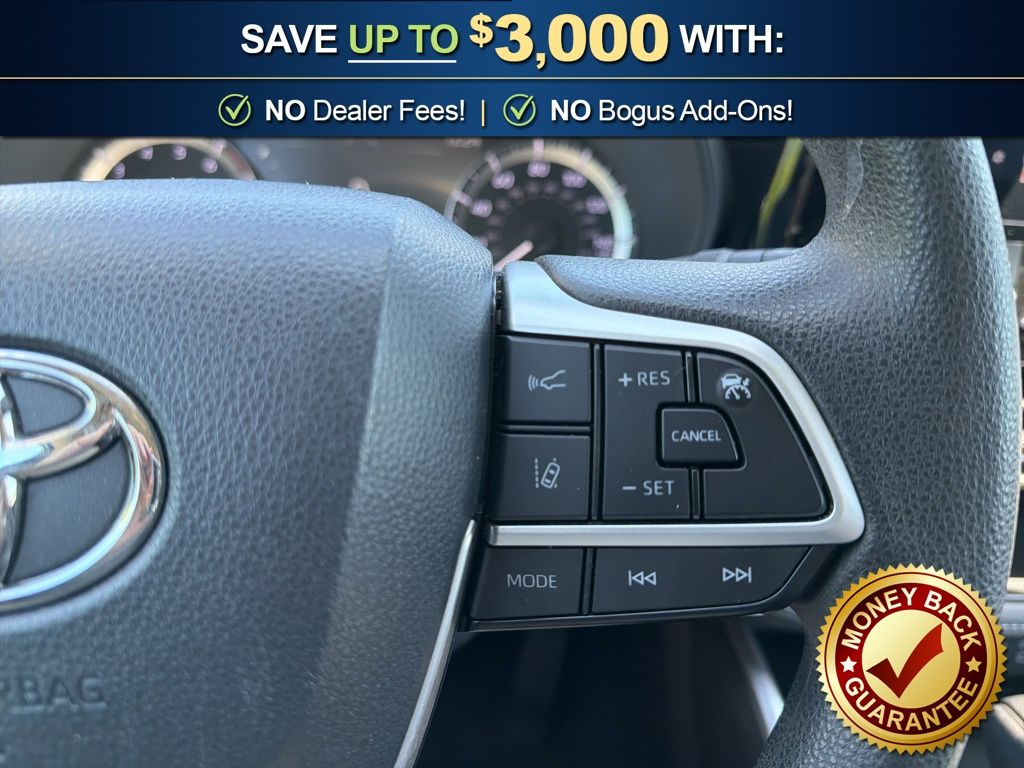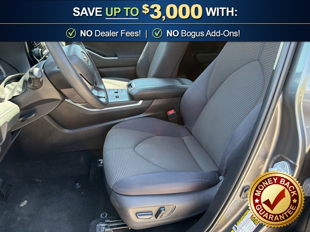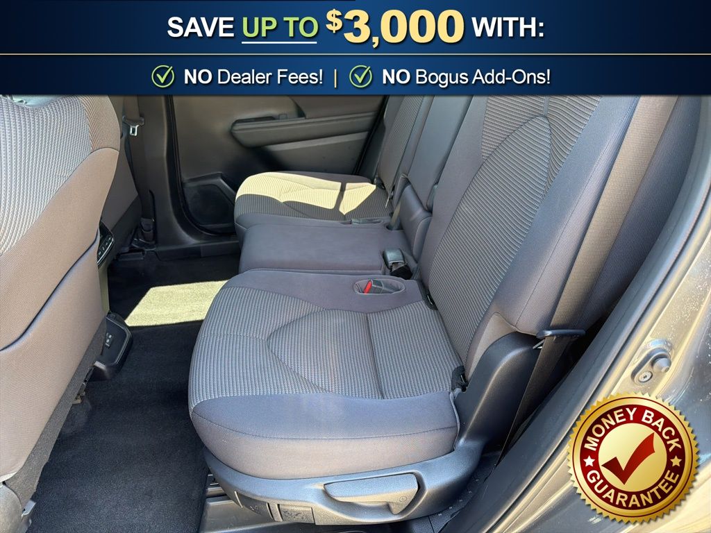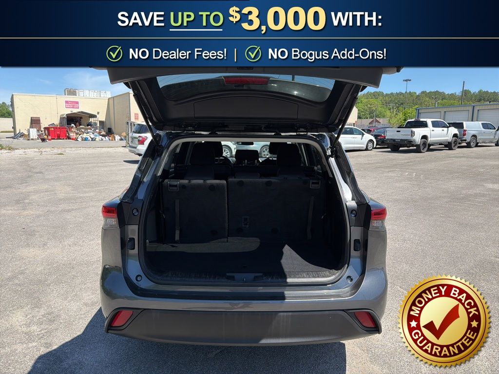 18" Painted Alloy Wheels, 3.329 Axle Ratio, 3rd row seats: split-bench, 4-Wheel Disc Brakes, 6 Speakers, ABS brakes, Air Conditioning, All Weather Floor & Cargo Liner (TMS), Alloy wheels, AM/FM radio: SiriusXM, Apple CarPlay/Android Auto, Auto High-beam Headlights, Automatic temperature control, Brake assist, Bumpers: body-color, Cargo Cross Bars (TMS), Clear Rear Bumper Applique (TMS), Delay-off headlights, Driver door bin, Driver vanity mirror, Dual front impact airbags, Dual front side impact airbags, Electronic Stability Control, Emergency communication system: Safety Connect (up to 10-year trial subscription), Engine Immobilizer, Exterior Parking Camera Rear, Fabric Seat Trim, Four wheel independent suspension, Front anti-roll bar, Front Bucket Seats, Front Center Armrest, Front dual zone A/C, Front reading lights, Fully automatic headlights, Heated door mirrors, Illuminated entry, Knee airbag, L Grade Package, Low tire pressure warning, Occupant sensing airbag, Outside temperature display, Overhead airbag, Overhead console, Panic alarm, Passenger door bin, Passenger vanity mirror, Power door mirrors, Power driver seat, Power steering, Power windows, Quick Charge Cables (TMS), Radio: 8" Toyota Audio Multimedia, Rear air conditioning, Rear anti-roll bar, Rear reading lights, Rear seat center armrest, Rear window defroster, Rear window wiper, Reclining 3rd row seat, Remote keyless entry, Speed control, Speed-sensing steering, Split folding rear seat, Spoiler, Steering wheel mounted audio controls, Tachometer, Telescoping steering wheel, Tilt steering wheel, Traction control, Trip computer, Turn signal indicator mirrors, Variably intermittent wipers. 2023 Toyota Highlander L