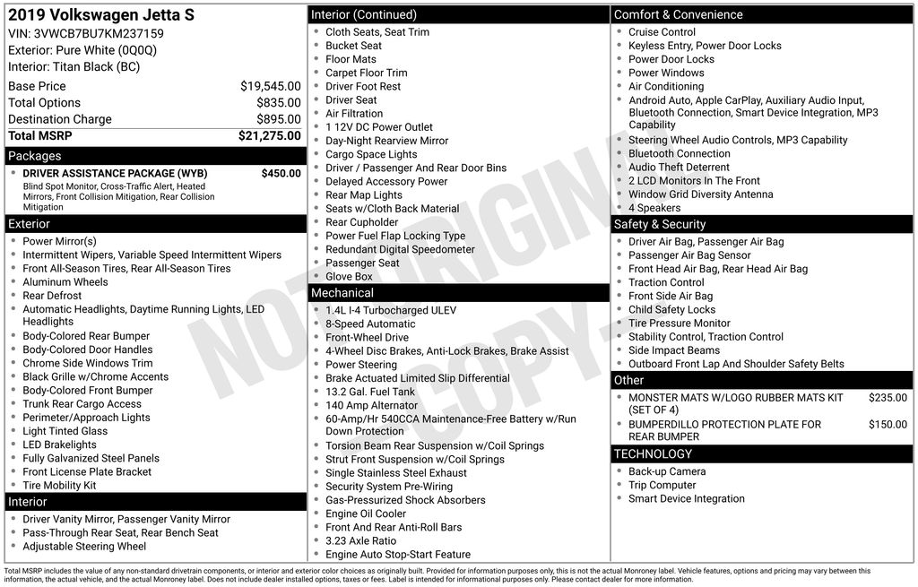 Black Cloth, 4 Speakers, 4-Wheel Disc Brakes, ABS brakes, Air Conditioning, Alloy wheels, AM/FM radio, Brake assist, Bumperdillo Protection Plate for Rear Bumper, Bumpers: body-color, Cloth Seat Trim, Delay-off headlights, Driver Assistance Package, Driver door bin, Driver vanity mirror, Dual front impact airbags, Dual front side impact airbags, Electronic Stability Control, Exterior Parking Camera Rear, Front anti-roll bar, Front Bucket Seats, Front Center Armrest, Front Comfort Seats, Front wheel independent suspension, Fully automatic headlights, Illuminated entry, Low tire pressure warning, Monster Mats w/Logo Rubber Mats Kit (Set of 4), Occupant sensing airbag, Outside temperature display, Overhead airbag, Panic alarm, Passenger door bin, Passenger vanity mirror, Power door mirrors, Power steering, Power windows, Radio data system, Radio: Composition Color w/6.5" Touchscreen, Rear anti-roll bar, Rear reading lights, Rear window defroster, Remote keyless entry, Speed control, Speed-sensing steering, Split folding rear seat, Steering wheel mounted audio controls, Tachometer, Telescoping steering wheel, Tilt steering wheel, Traction control, Trip computer, Variably intermittent wipers, Wheels: 16" Silver Rama, Black Cloth. 2019 Volkswagen Jetta 1.4T S