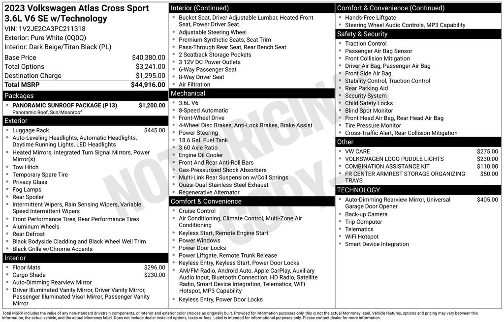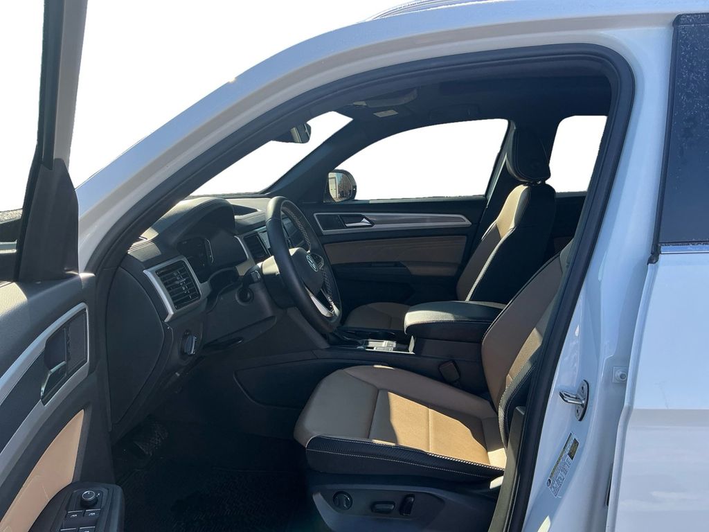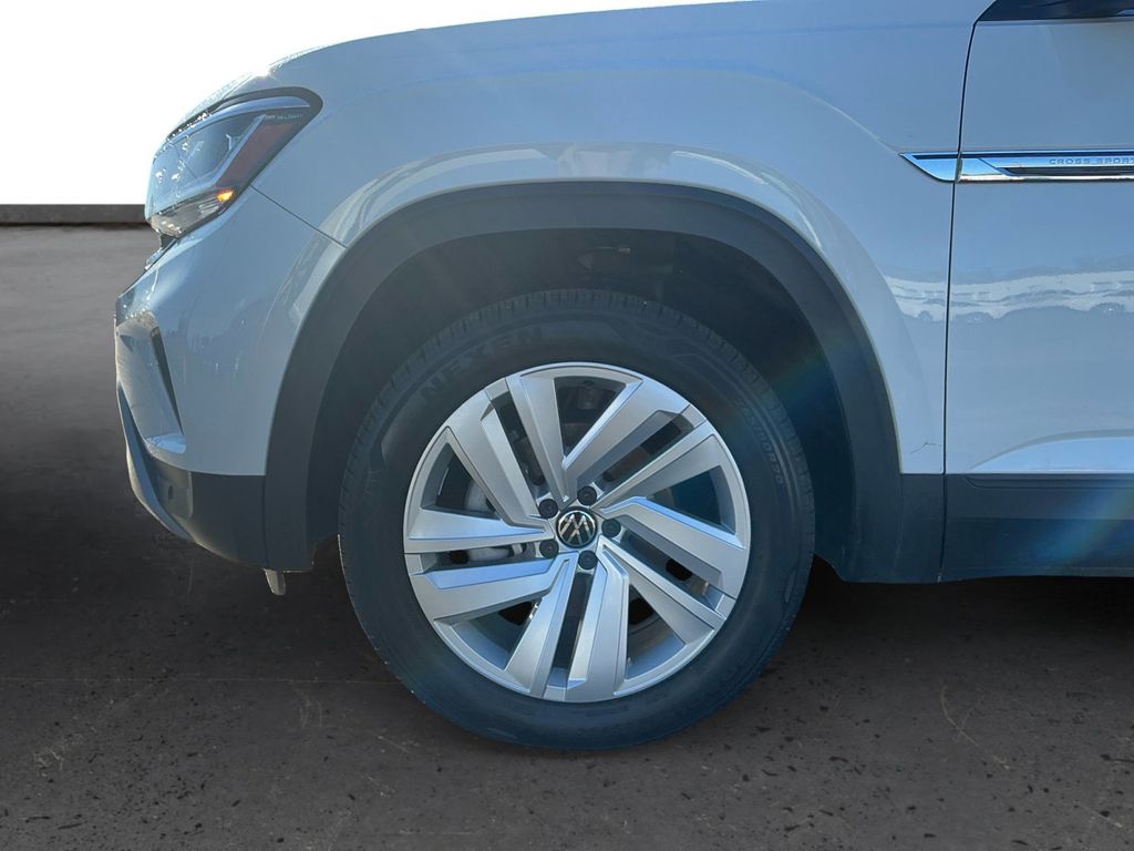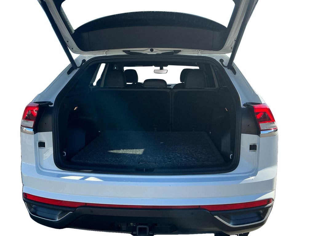 2023 Volkswagen Atlas Cross Sport 3.6L V6 SE w/Technology Pure White 3.6L V6 SE w/Technology FWD 8-Speed Automatic with Tiptronic 3.6L VR6 3.60 Axle Ratio, 4-Wheel Disc Brakes, 6 Speakers, ABS brakes, Air Conditioning, Alloy wheels, AM/FM radio: SiriusXM with 360L, Auto-dimming Rear-View mirror, Automatic temperature control, Brake assist, Bumpers: body-color, Compass, Delay-off headlights, Driver door bin, Driver vanity mirror, Dual front impact airbags, Dual front side impact airbags, Electronic Stability Control, Emergency communication system: VW Car-Net Safe & Secure 5-year, Exterior Parking Camera Rear, First Aid Kit, Four wheel independent suspension, Fr Center Armrest Storage Organizing Trays (DISC), Frameless Auto-Dimming Rearview Mirror, Front anti-roll bar, Front Bucket Seats, Front Center Armrest, Front dual zone A/C, Front fog lights, Front reading lights, Fully automatic headlights, Heated Comfort Front Bucket Seats, Heated door mirrors, Heated front seats, Heavy Duty Trunk Liner w/VW CarGo Blocks, Illuminated entry, Leather Shift Knob, Low tire pressure warning, Occupant sensing airbag, Outside temperature display, Overhead airbag, Overhead console, Panic alarm, Panoramic Sunroof Package, Passenger door bin, Passenger vanity mirror, Perforated V-Tex Leatherette Seating Surfaces, Power door mirrors, Power driver seat, Power Liftgate, Power steering, Power Tilting & Sliding Panoramic Sunroof, Power windows, Privacy Cover, Radio data system, Radio: MIB3 Composition Media w/8" Touchscreen, Rain sensing wipers, Rear anti-roll bar, Rear reading lights, Rear seat center armrest, Rear window defroster, Rear window wiper, Remote keyless entry, Roadside Assistance Kit, Roof Rack Base Carrier Bars (Set of 2), Rubber Mats Kit, Security system, Speed control, Speed-sensing steering, Split folding rear seat, Spoiler, Standard Suspension, Steering wheel mounted audio controls, Tachometer, Telescoping steering wheel, Tilt steering wheel, Traction control, Trip computer, Turn signal indicator mirrors, Variably intermittent wipers, Volkswagen Logo Puddle Lights, VW Care, Wheels: 20" x 8J 5-Spoke Silver Painted Alloy.