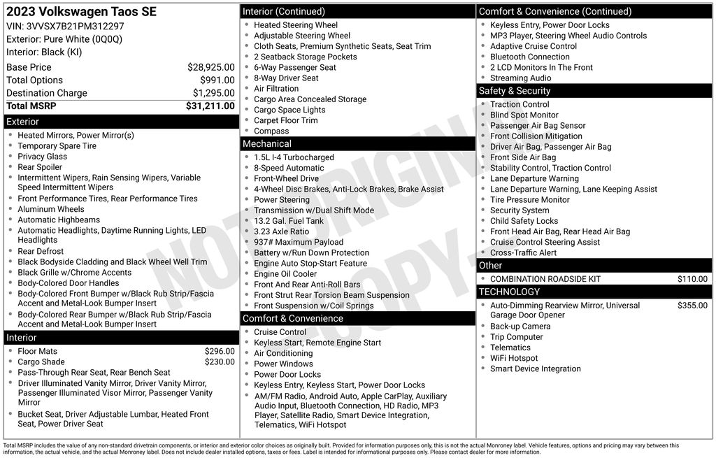 2023 Volkswagen Taos 1.5T SE SUV I4 Turbocharged DOHC 16V LEV3-SULEV30 158hp